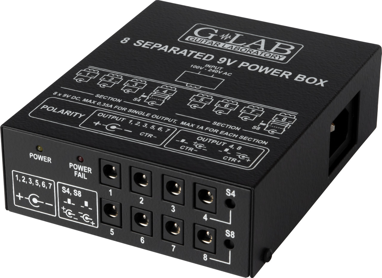 PB-1 is the power supply for guitar effects with regulated 9V direct current (DC). It has eight full galvanically separated outputs which enable to built professional guitar systems without ground loops and crosstalks. SMPS (Switching-Mode Power Supply) technology is applied in the PB-1. The Power Supply does not generate the hum even if it is placed close to the other effects (especially Wah Wahs having inductors).